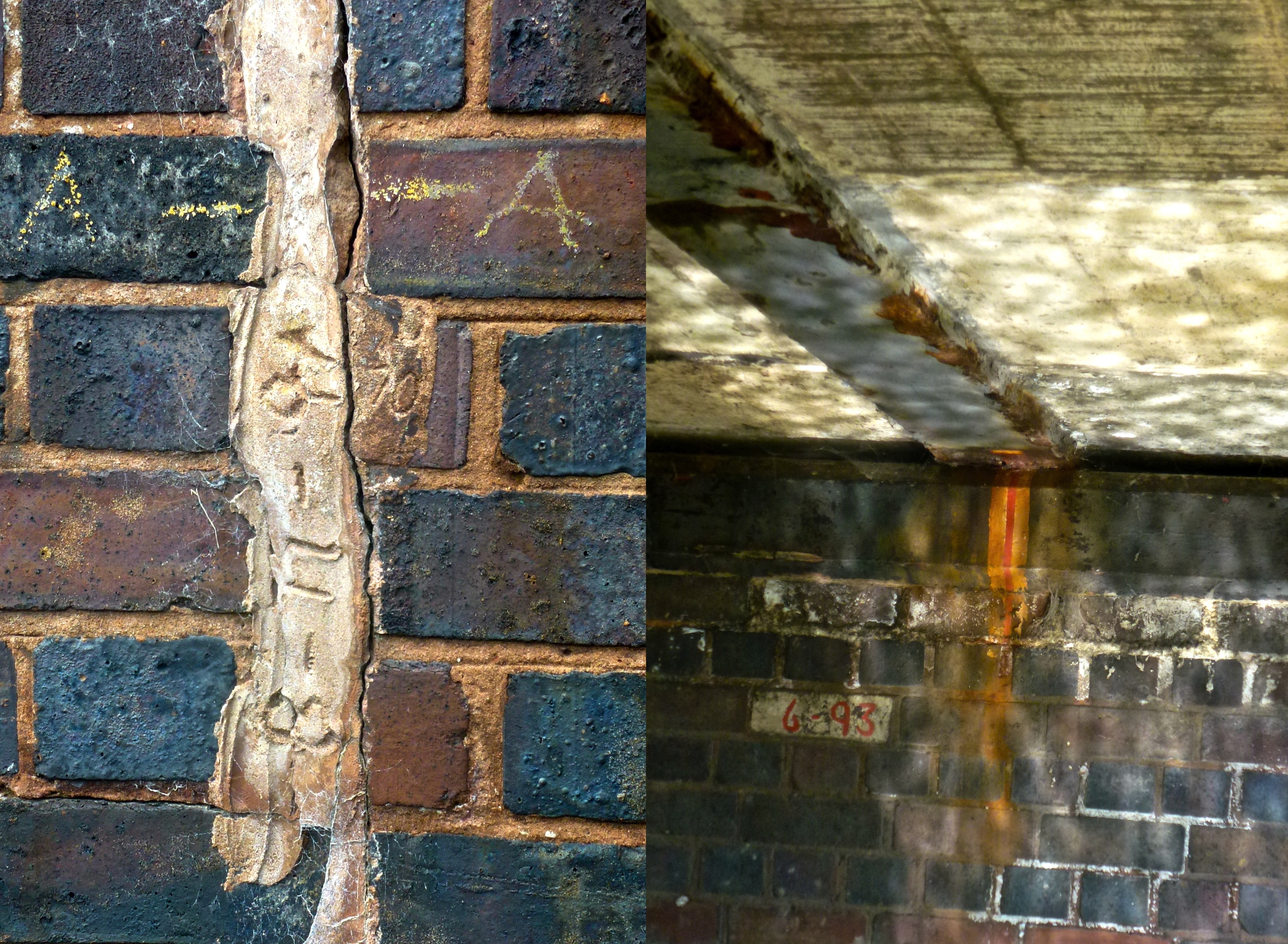 Whilst we were under the bridge, we noticed that someone, somewhere is concerned about the fabric of this edifice. There are datum marks and references in several places. On the eastern abutment, a 30 inch fissure in the brickwork is grouted, with the date 8-11-91 scratched into the fresh mortar. This itself is obliterating a similarly etched surveyor’s mark from 1970. A horizontal datum line in yellow wax crayon drawn across the crack no longer aligns, whilst a painted red marker underneath runs from a deck girder, over the insert plank and onto the brickwork. This is serious monitoring