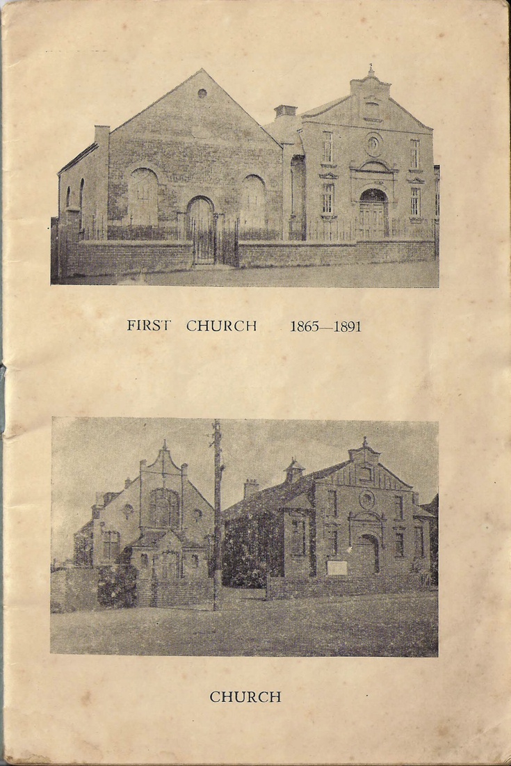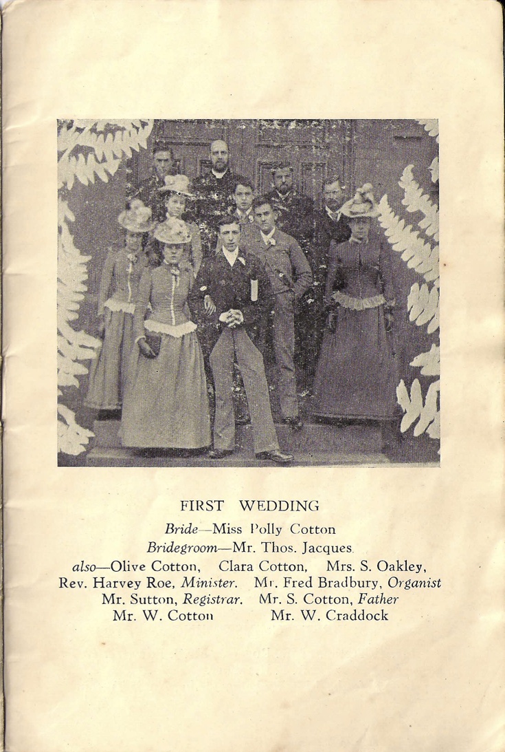 I have been looking through the 1951 commemorative booklet and readers may find some of these documents of interest as they contain names and dates, which may be ancestors. There is the first christening photo and the first wedding photo conducted there, and a very rare photo of the first Methodist Church on the site. This stood in front of the present building. A local authority history site gives an inaccurate artistic “guess” at what this building looked like, in fact.