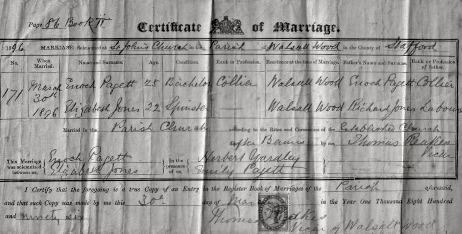 The 1896 Marriag Certificate of Enoch Pagett and Elizabeth Jones. From the Lynk family archive.