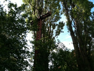 At the bottom of the structure in amongst the undergrowth is what appears to be some wheels and a counterbalance arrangement.