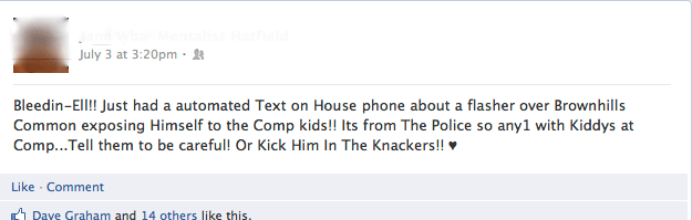 It seems there are reports circulating locally via social media of indecent exposure incidents. These complaints mainly seem to appear in summer, but one response on Twitter suggested the e-fit of the suspect wanted in connection with the Rising Sun incidents last winter was close to the description of the man involved in one of the recent incidents.