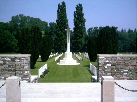 Like all of the military cemeteries in this part of Belgium there are no weeds to be seen in the grounds, the lawns are immaculate, red roses bloom, and not one single pebble in the gravel footpaths is disturbed. Sometimes little wooden crosses with their poppies can be seen by graves; sometimes wreaths and bunches of fresh flowers have been placed by headstone there.