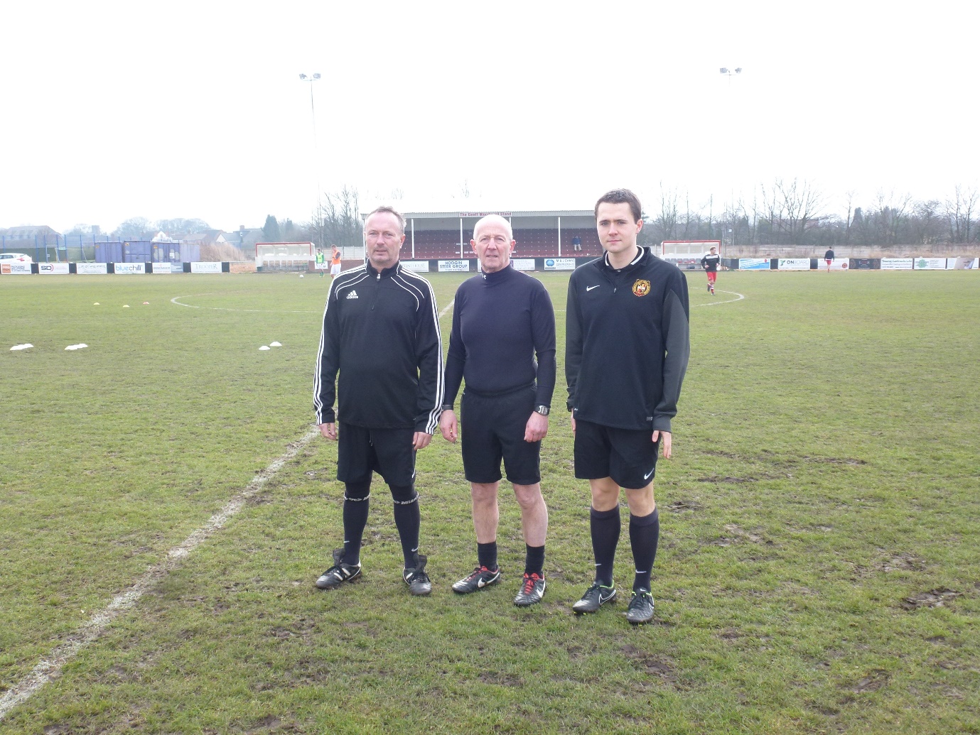 Match referee Mr Gary Walker and his two assistants, Stuart Winton and Mark Winston kindly posing for the photo before the match got under way on a cold and clear winter’s afternoon.