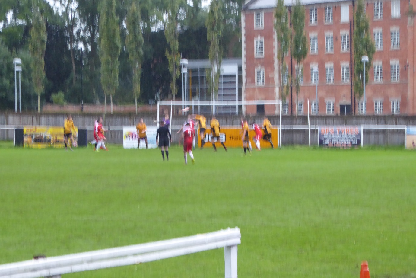 In the blur of a cloudburst the Wood score their first goal, late in the second half