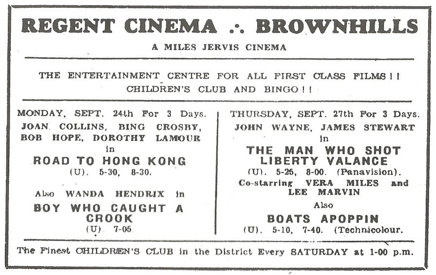 The Regent continued to be a well-patronised and profitable cinema, but the threat of redevelopment still hung over it, so the improvements and new name never took place. In the event, Miles Jervis III was only able to operate the Regent for about nine months before it became the victim of a Compulsory Purchase Order. It closed on 29th September 1962 with John Ford’s masterpiece, The Man Who Shot Liberty Valance. With hindsight, it is possible to see what a wonderful choice of final film this was. I doubt if anyone in the audience heard the famous line, ‘Print the legend’, and thought of the history of local cinemas, but maybe someone realised that the town of Shinbone featured in the film was Brownhill’s transatlantic alter-ego, and that Shinbone’s Liberty Valance was like Brownhill’s Dick Turpin, who had once sped past the future site of the Regent, creating a legend [Oh dear god no – Bob].